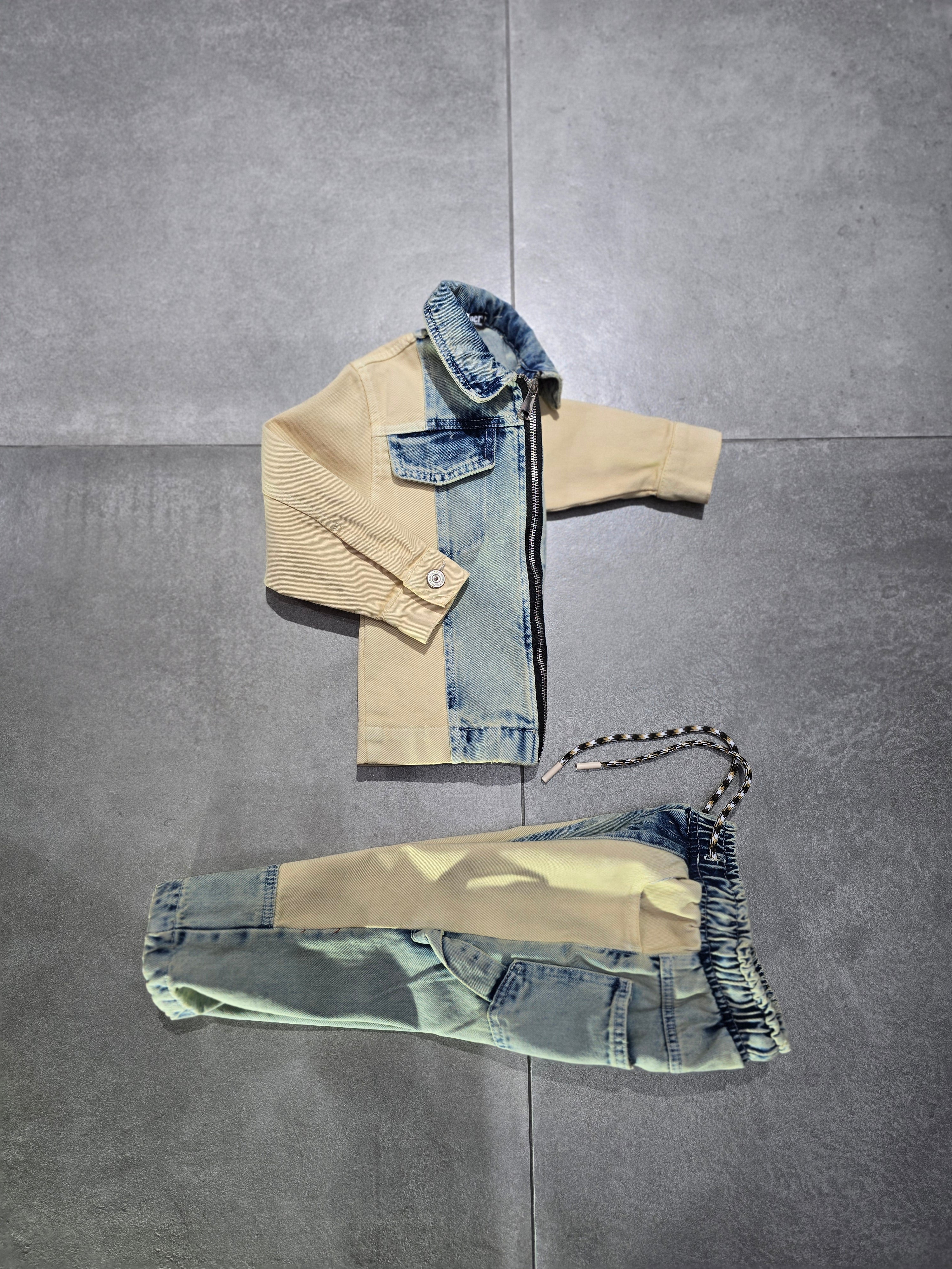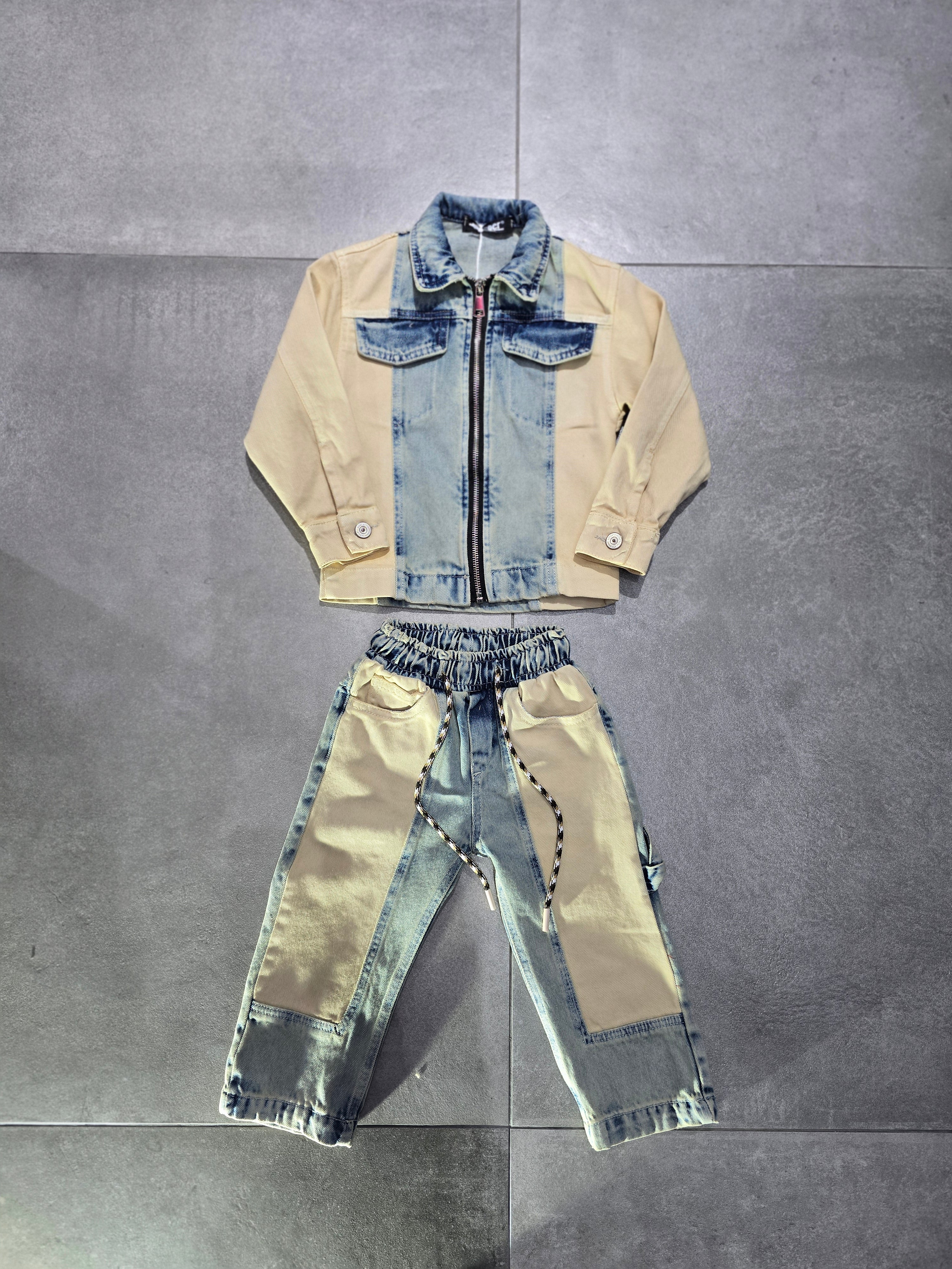 COORDSET JASPER BRAND DOPPIO JEANS LAVAGGIO SABBIA E LAVAGGIO BEIGE JEANS MOLLA IN VITA MOD CARPENTER JACKET JEANS TASCHE AVANTI SIZE 1/16 ANNI